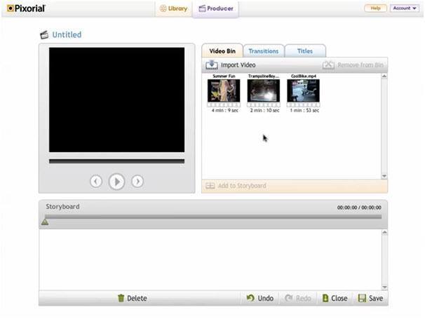 As well as Pixorial being your own personal online video library, there is a handy video editor under the ‘Producer’ tab that lets you combine videos, add transitions and titles. Once your video is complete there are buttons to easily share it on Twitter and Facebook as well as being able to email, download and even order a DVD copy of your edited video.